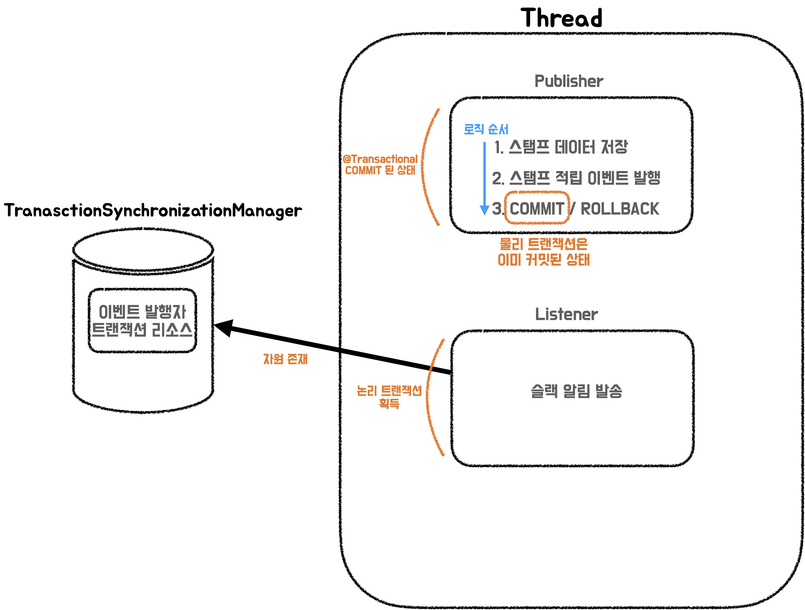 Publisher 트랜잭션이 커밋 되었더라도 아직 스레드 로컬에 자원이 남아 있기 때문에 Listener 측에서 얻는 트랜잭션은 논리 트랜잭션 입니다. 물리 트랜잭션이 커밋되어야 Listener 측의 쿼리가 flush() 가 되는데, 이미 물리 트랜잭션은 커밋된 상태라 Listener 측의 쿼리는 발생하지 않는 것입니다.