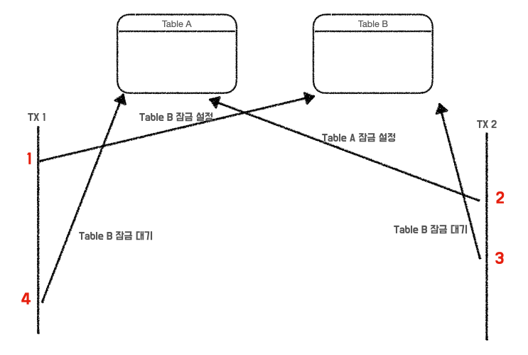 만약 A테이블과 B테이블에 각각 잠금을 거는 트랜잭션 TX1, TX2 가 있다고 가정해봅시다. TX1 은 B테이블에 잠금을 걸고 컨텍스트 스위칭이 발생해 TX2 가 A테이블에 잠금을 겁니다. 이후 B테이블에 잠금을 걸기 위해 TX1 이 잠금을 해제하길 기다립니다.