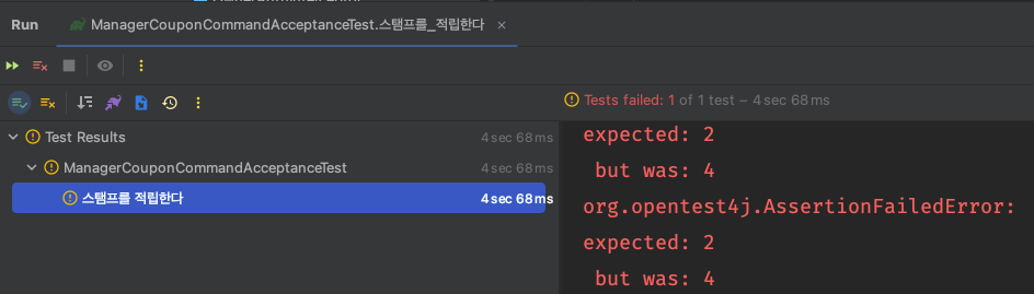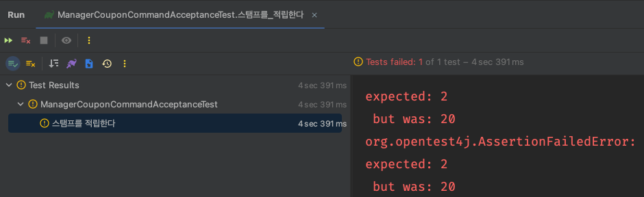 기대한대로 2개가 적립되었고, 스탬프 개수가 일치하지 않아 예외가 발생한것을 예외 메시지를 통해 확인할 수 있습니다.