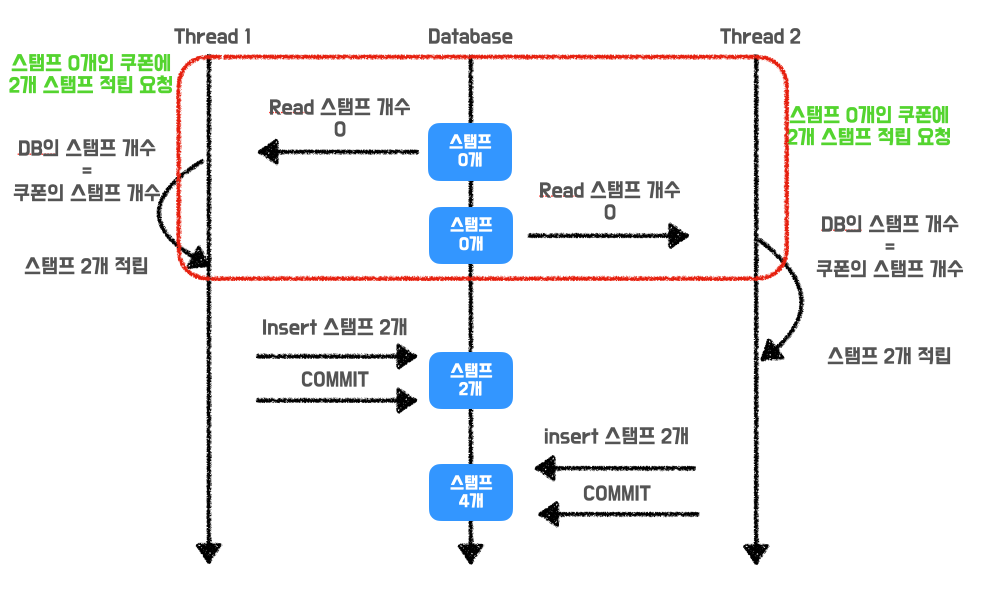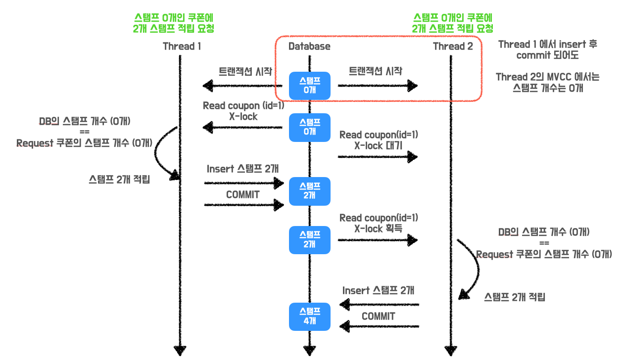 Thread1 의 트랜잭션이 COMMIT 되기 전에 Thread2 의 트랜잭션이 Coupon의 Stamp 개수를 읽기 때문에 2개의 스레드 모두 쿠폰의 스탬프 개수를 0으로 읽게 됩니다.