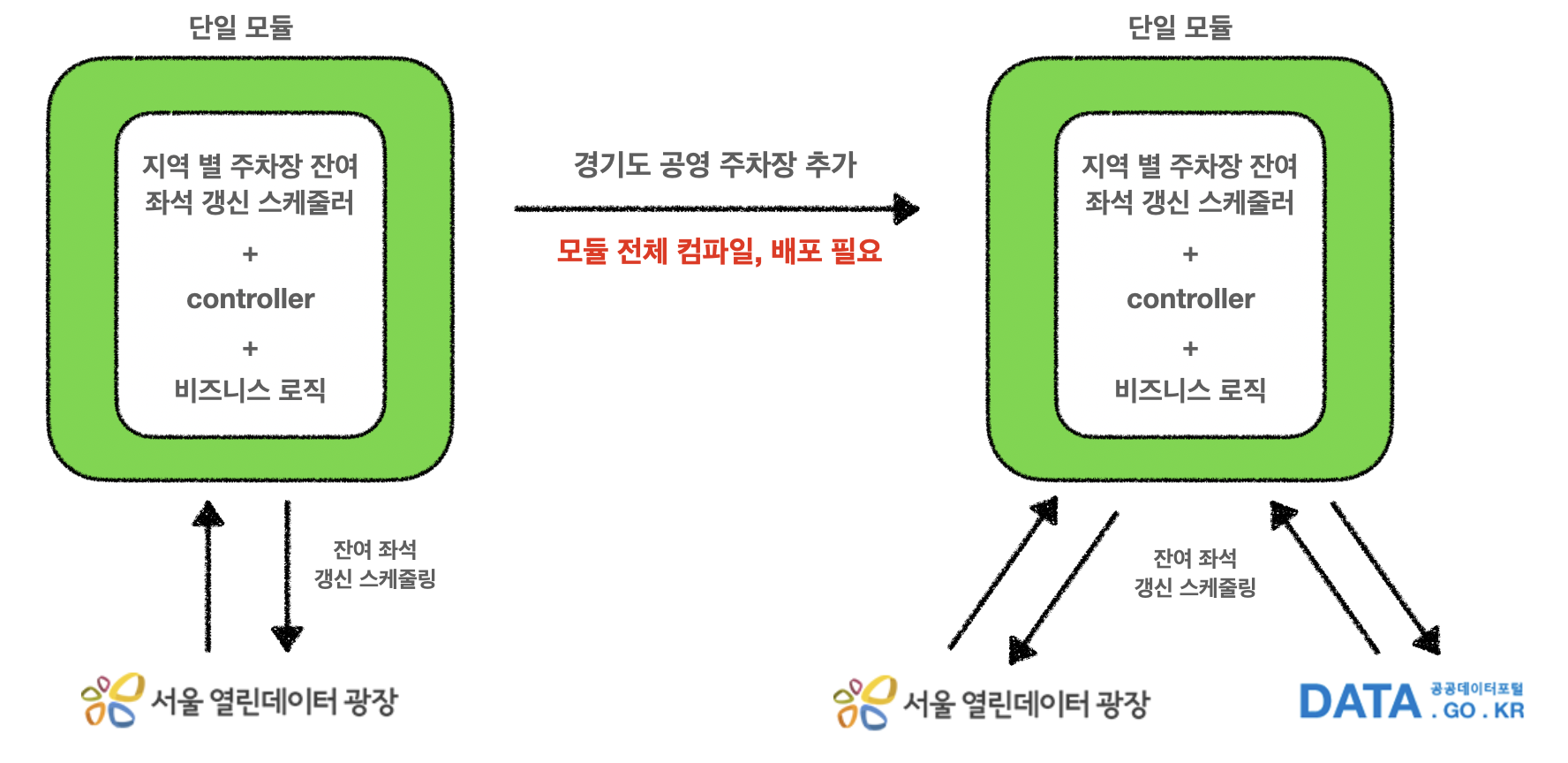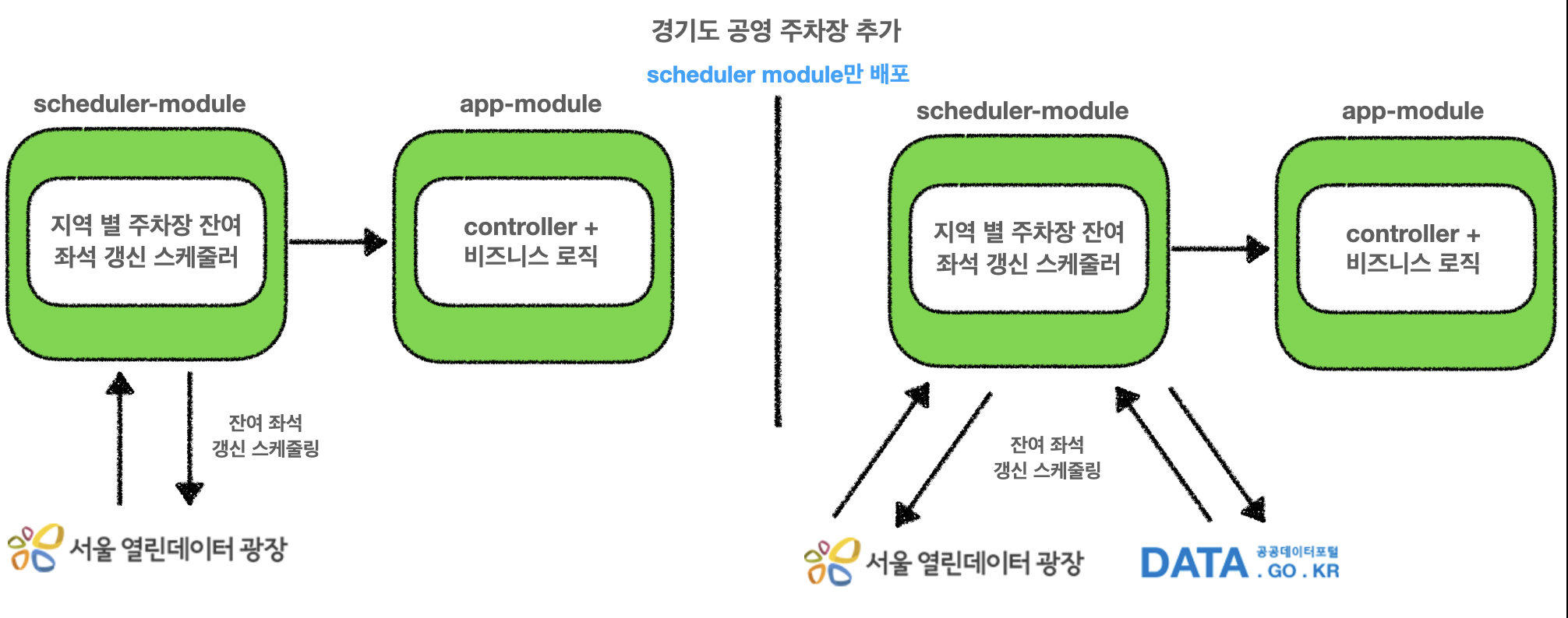- 스케줄러 모듈의 경우 경기도의 주차장 정보를 추가하더라도 독립적으로 배포가 가능해 확장성을 개선할 수 있습니다.
