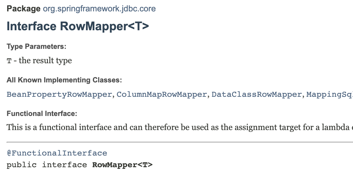 - RowMapper는 메서드가 하나만 존재하는 인터페이스라 람다 전달이 가능하다.